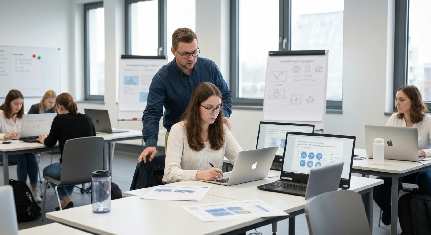Sie lernen – gemeinsam mit anderen Schulungsteilnehmern – unter Einsatz moderner Unterrichtsmethoden. Mit diesem Mix sind Sie fachlich und persönlich optimal für die Praxis gerüstet. Dazu gehören, je nach Thema, der Live-Unterricht in einem Klassenraum unserer virtuellen Online-Akademie Viona® genauso wie Projektarbeit, die Erstellung und Präsentation eigener Arbeitsergebnisse, das Studium von Fachliteratur u. a. Während der gesamten Weiterbildung steht Ihnen ein moderner PC-Arbeitsplatz zur Verfügung. Sie werden von hochqualifizierten Fachleuten unterrichtet und betreut, die über umfassende theoretische Kenntnisse und fachpraktische Erfahrungen verfügen. Unsere Koordinatoren, die Sie auch beim Lernen begleiten, bieten Ihnen Unterstützung und Hilfestellung bei allen Fragen.