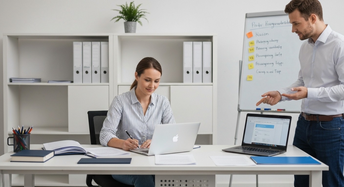 Sie lernen – gemeinsam mit anderen Schulungsteilnehmern – unter Einsatz moderner Unterrichtsmethoden. Mit diesem Mix sind Sie fachlich und persönlich optimal für die Praxis gerüstet. Dazu gehören, je nach Thema, der Live-Unterricht in einem Klassenraum unserer virtuellen Online-Akademie Viona® genauso wie Projektarbeit, die Erstellung und Präsentation eigener Arbeitsergebnisse, das Studium von Fachliteratur u. a. Während der gesamten Weiterbildung steht Ihnen ein moderner PC-Arbeitsplatz zur Verfügung. Sie werden von hochqualifizierten Fachleuten unterrichtet und betreut, die über umfassende theoretische Kenntnisse und fachpraktische Erfahrungen verfügen. Unsere Koordinatoren, die Sie auch beim Lernen begleiten, bieten Ihnen Unterstützung und Hilfestellung bei allen Fragen.