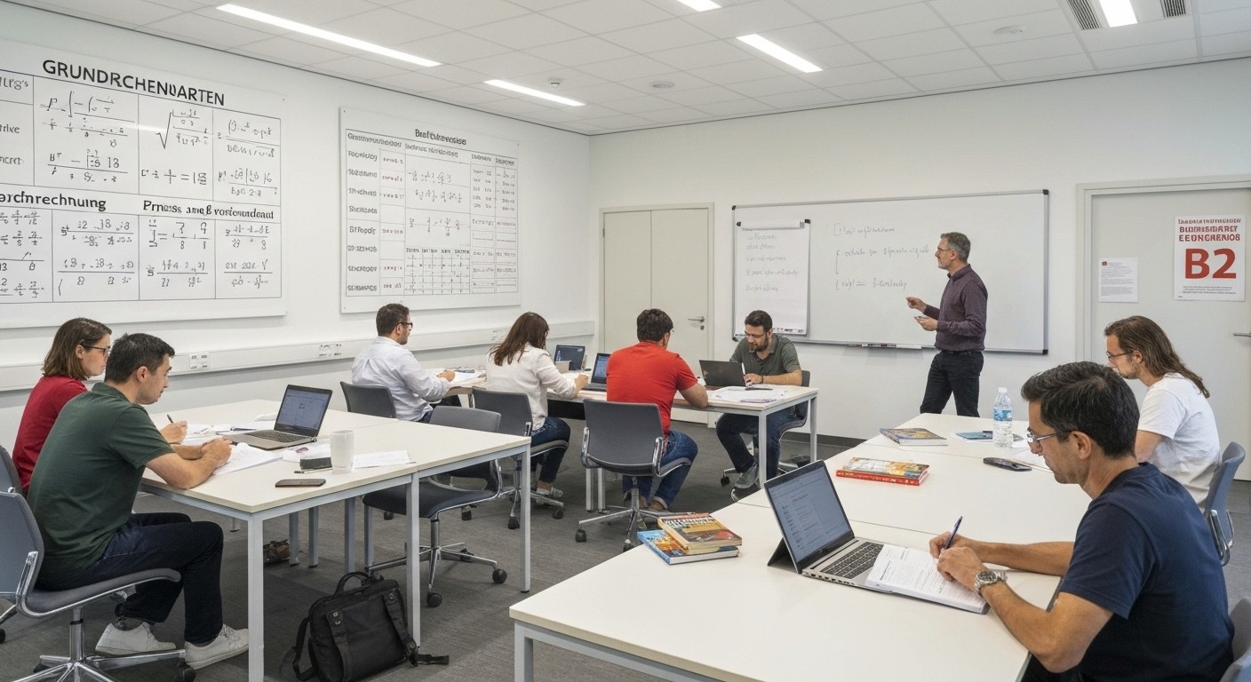 In diesem Kurs vermitteln wir Ihnen mathematische Inhalte, die Sie benötigen, um Ihre Umschulung, Teilqualifikation oder Qualifizierung stressfrei und sicher abschließen zu können: Sie werden im Umgang mit den vier Grundrechenarten sowie der Zins- und Prozentrechnung fit gemacht. Mit unserer langjährigen pädagogischen Erfahrung unterstützen wir Sie dabei, sich neues Wissen anzueignen oder vorhandene Kenntnisse aufzufrischen und langfristig im Gedächtnis zu verankern. Die zusätzlich vermittelten Deutschkenntnisse auf dem Niveau B2 helfen insbesondere Migranten zum Erfolg auf dem Arbeitsmarkt.