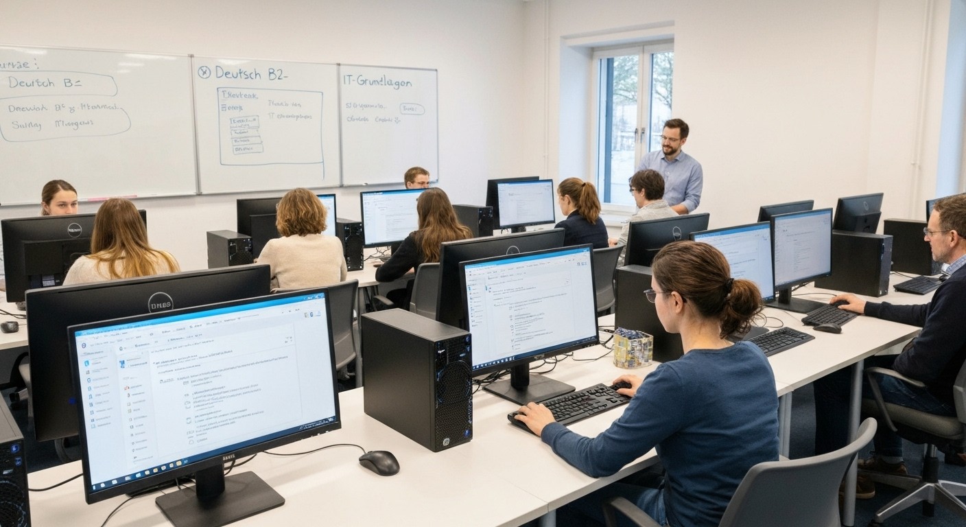 In diesem Kurs vermitteln wir Ihnen breitgefächerte PC-Kenntnisse, die Sie benötigen, um Ihre Umschulung, Teilqualifikation oder Qualifizierung stressfrei und sicher abschließen zu können. Sie erlernen als erstes, einen Computer zu bedienen. Anschließend widmen Sie sich den wichtigsten Programmen, die in fast allen Büroberufen genutzt werden: Internet und E-Mail mit Outlook, Textverarbeitung mit Word und Tabellenkalkulation mit Excel. Mit unserer langjährigen pädagogischen Erfahrung unterstützen wir Sie dabei, sich neues Wissen anzueignen oder vorhandene Kenntnisse aufzupolieren und langfristig im Gedächtnis zu verankern. Die zusätzlich vermittelten Deutschkenntnisse auf dem Niveau B2 helfen insbesondere Migranten zum Erfolg auf dem Arbeitsmarkt.