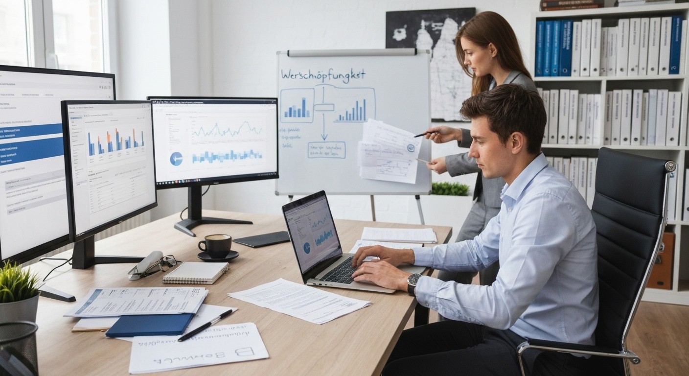 Sie lernen in diesem Modul die zentrale Aufgabe der Buchführung kennen, einschließlich der Grundlagen der Finanzbuchführung und der Belegerfassung. Sie erlernen kaufmännisches Rechnen, einfache Kalkulationsaufgaben und die doppelte Buchführung. Das Modul führt in Kalkulation und Kostenrechnung ein, vermittelt das Verständnis von Bilanzen und die Vorbereitung von Jahresabschlüssen. Zudem bietet es Exkurse in Statistik und Buchführungsvergleich. Sie erfahren die gesamte Wertschöpfungskette vom Angebot über den Auftrag und den Lieferschein bis zur Rechnung und üben die Bearbeitung der Geschäftsvorfälle mit einer ERP-Software. Gleichzeitig gewinnen Sie einen Überblick über die Unternehmensorganisation und -steuerung.