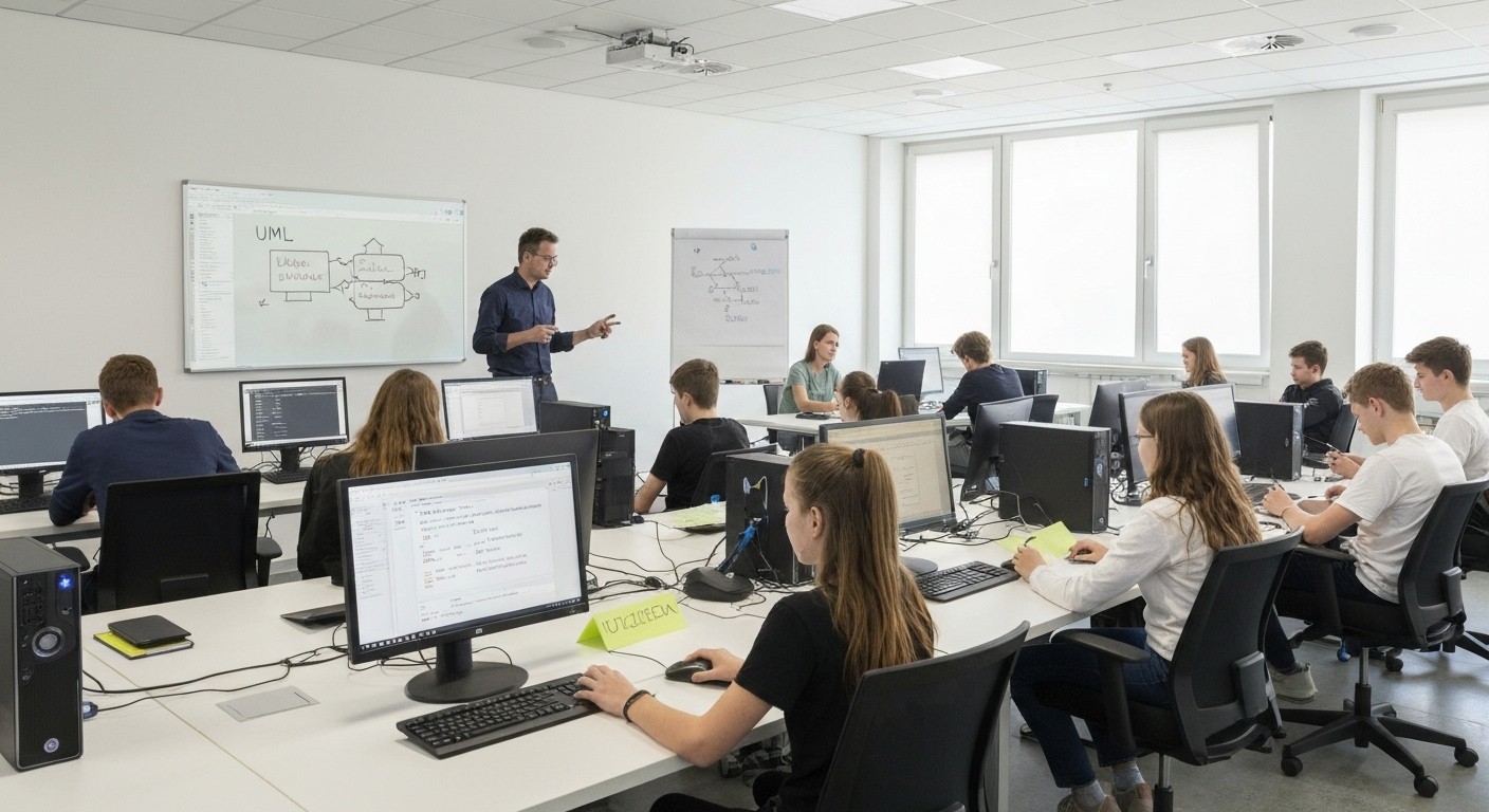 Vier der tragenden Fähigkeiten aller Fachinformatiker-Fachrichtungen sind umfangreiche Kenntnisse in Softwareentwicklung, Vorplanungsstufen mit UML, der Netzwerktechnik sowie Planung und Umsetzung von Datenbanken. Um einen versierten Einstieg in diese IT-Grundkompetenzen zu finden, werden zuvor die am PC notwendigen Fertigkeiten dafür vorbereitet.