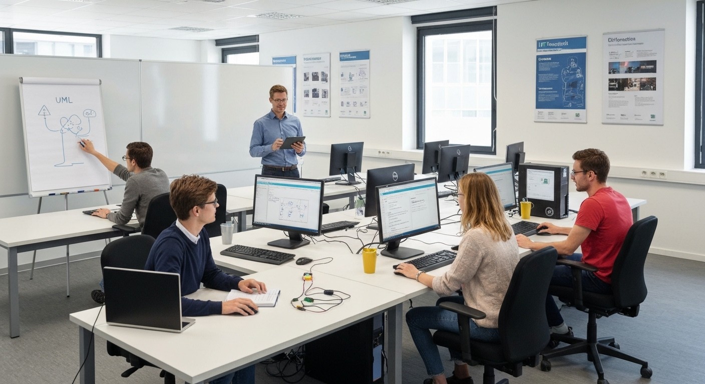Vier der tragenden Fähigkeiten aller Fachinformatiker-Fachrichtungen sind umfangreiche Kenntnisse in Softwareentwicklung, Vorplanungsstufen mit UML, der Netzwerktechnik sowie Planung und Umsetzung von Datenbanken. Um einen versierten Einstieg in diese IT-Grundkompetenzen zu finden, werden zuvor noch Einstiegsgrundlagen für die technischen IT-Berufsbilder vermittelt.