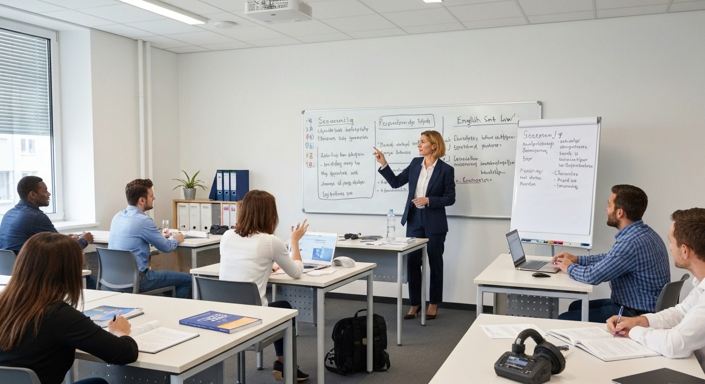 In diesem Vorbereitungskurs festigen und erweitern Sie Ihre Grundlagen der englischen Sprache in Wort und Schrift, verständigen Sie sich auf Englisch und lernen die geschäftliche Kommunikation und Korrespondenz kennen. Sie erlangen eine Grundsicherheit für die Sprache, die Sie leicht kommunizieren lässt, und Sie reduzieren Hemmungen zu sprechen. Außerdem erhalten Sie einen Einblick in die Rechtsgrundlagen und schaffen so die optimale Basis für eine erfolgreiche Teilnahme an einer Umschulung zur Fachkraft für Schutz und Sicherheit.